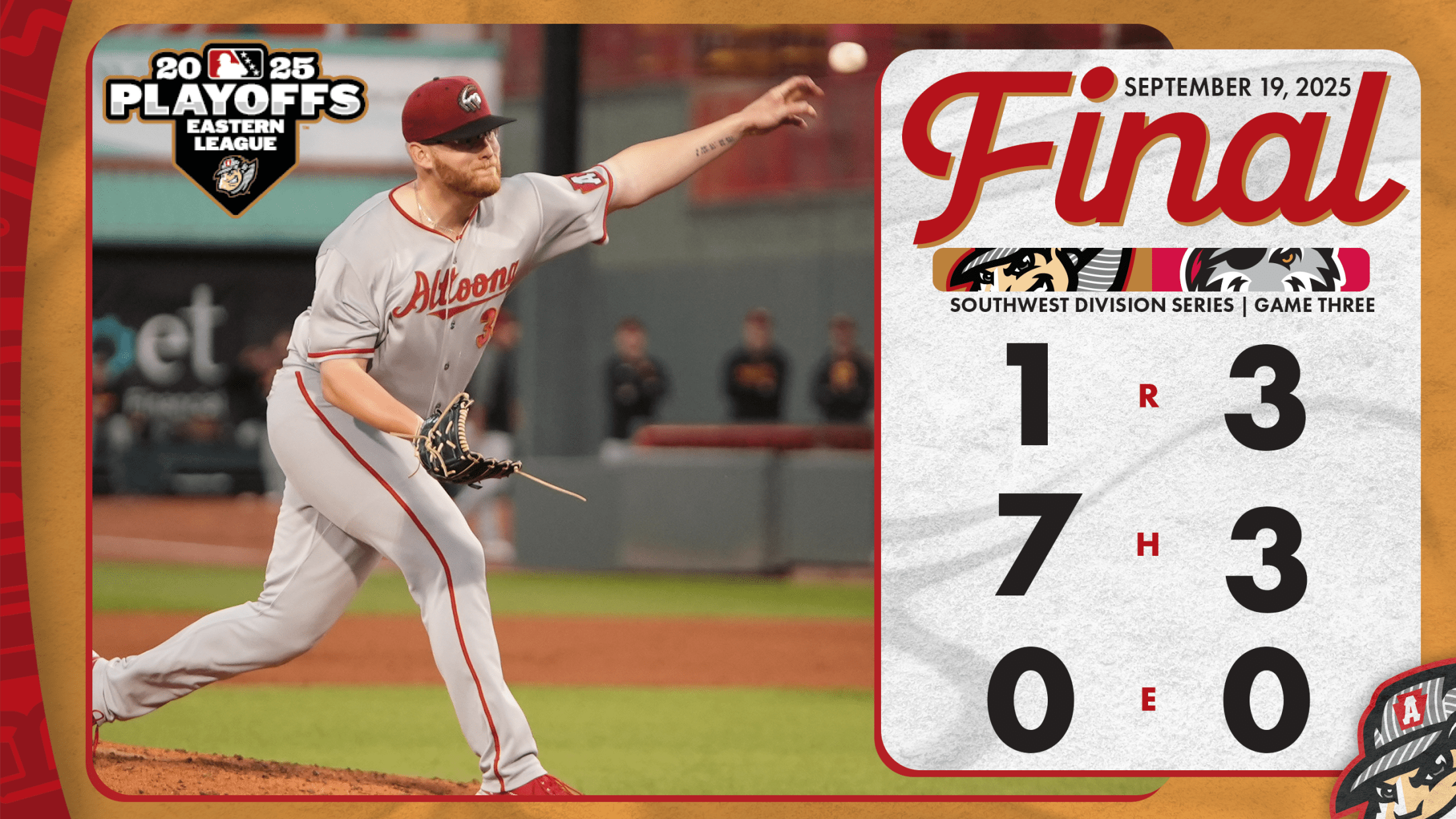 ERIE, Pa. – The Erie SeaWolves defeated the Curve 3-1 on Friday night at UPMC Park and advanced to the Eastern League Championship Series. After scoring 11 runs in the series opener, Altoona was held to just one run in each of the final two games of the series. Nick