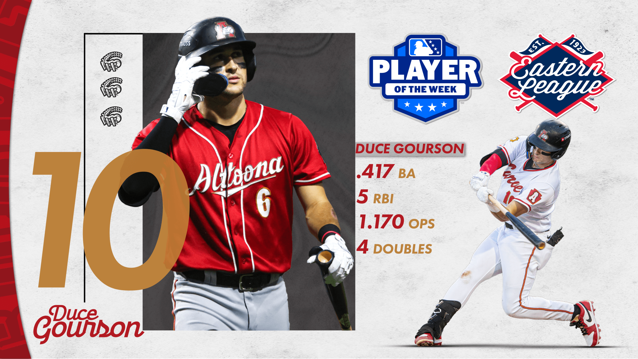 CURVE, PA – Infielder Duce Gourson was named the Eastern League Player of the Week on Monday, September 15 after leading Eastern League Players in hits (10), extra-base hits (4) and OPS (1.170) during Altoona’s week-long series with the Erie SeaWolves. Gourson batted 10-for-24 (.417) with 4 2B, 1 HR