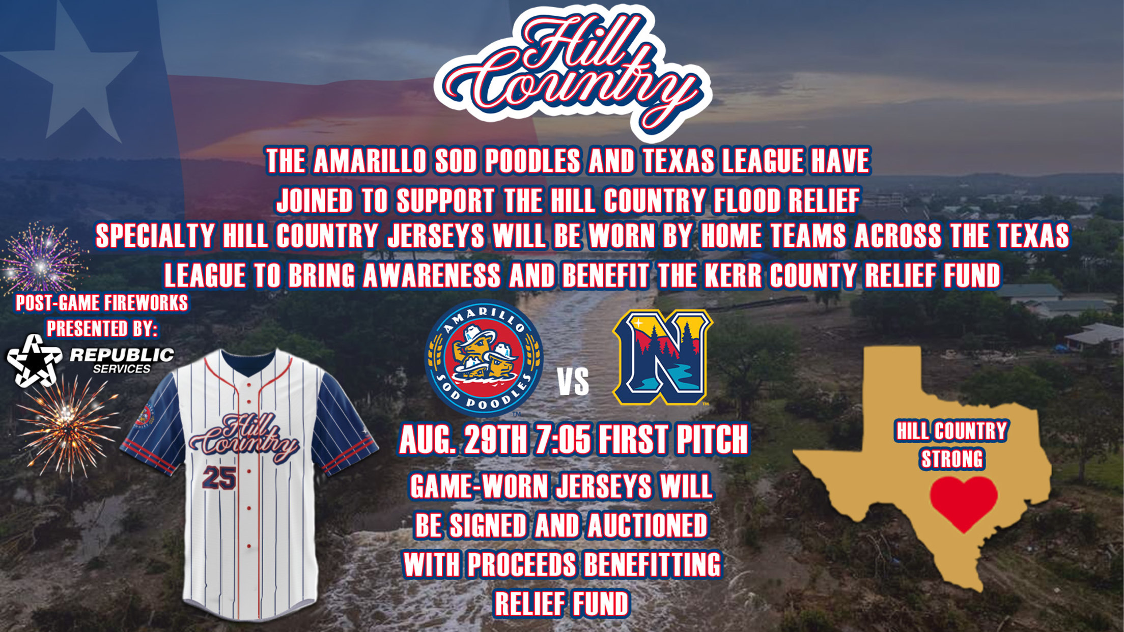 Amarillo, Texas – The Amarillo Sod Poodles and Texas League today announced an allied effort amongst the league’s 10 clubs to raise funds to support the Ingram Little League in Ingram, Texas, and to help rebuild local fields and programs in Kerr County, Texas, that were devastated by the floods.