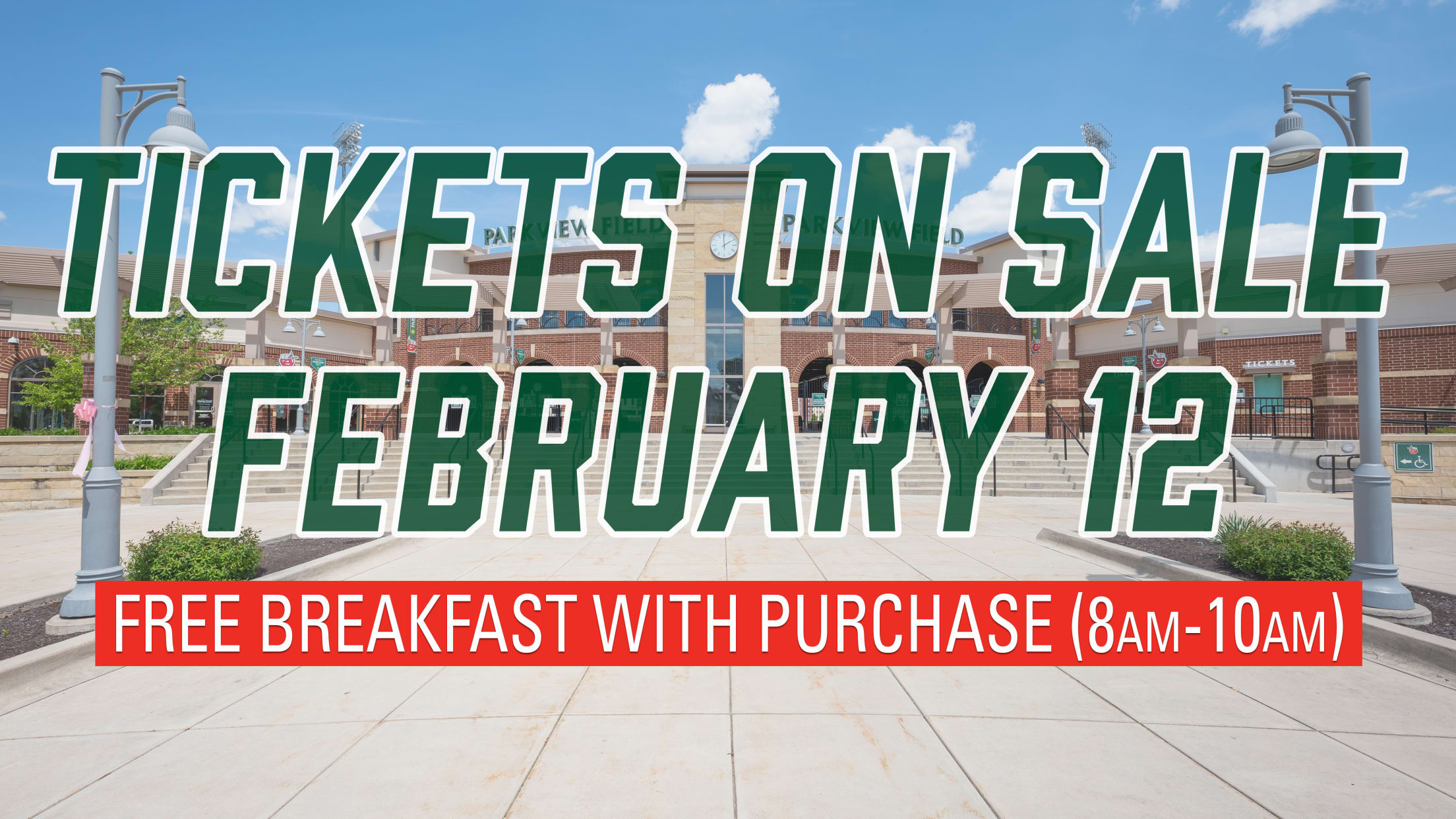 Fans can purchase their tickets in person at Parkview Field, by calling 260-482-6400, and at TinCapsTickets.com. For fans that purchase tickets at Parkview Field between 8-10 a.m. on Feb. 12, the TinCaps are offering a free breakfast buffet in the ballpark's Suite Level Lounge.