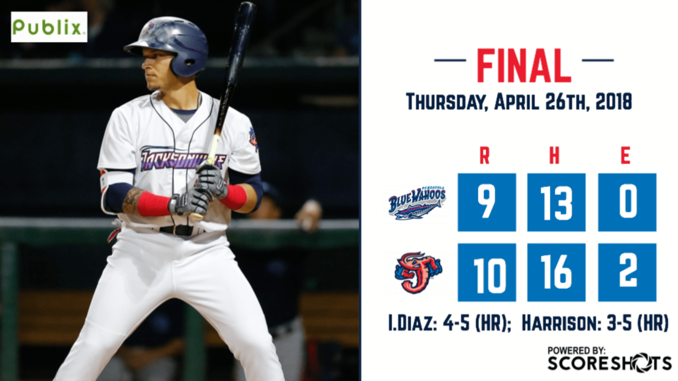 Both teams scored in each of the first three innings. The Blue Wahoos (9-12) took the lead with a three-run first inning against Jumbo Shrimp right-hander Brandon Barker, but Jacksonville (9-11) answered against right-hander Daniel Wright, with two runs in the bottom of the inning, including Harrison's first Double-A home run out of the ballpark to left field. After Pensacola extended the lead to 4-2 in the second inning, Jacksonville rallied for three runs, including third baseman Brian Schales's first Double-A home run, and left fielder Austin Dean's RBI double for a 5-4 lead. Jacksonville right-hander Esmerling De La Rosa allowed three third-inning runs, including two on a two-out error by shortstop Mason Davis for a 7-5 Blue Wahoos lead. In the bottom of the inning, Davis hit an RBI triple, and Diaz hit a game-tying double.
