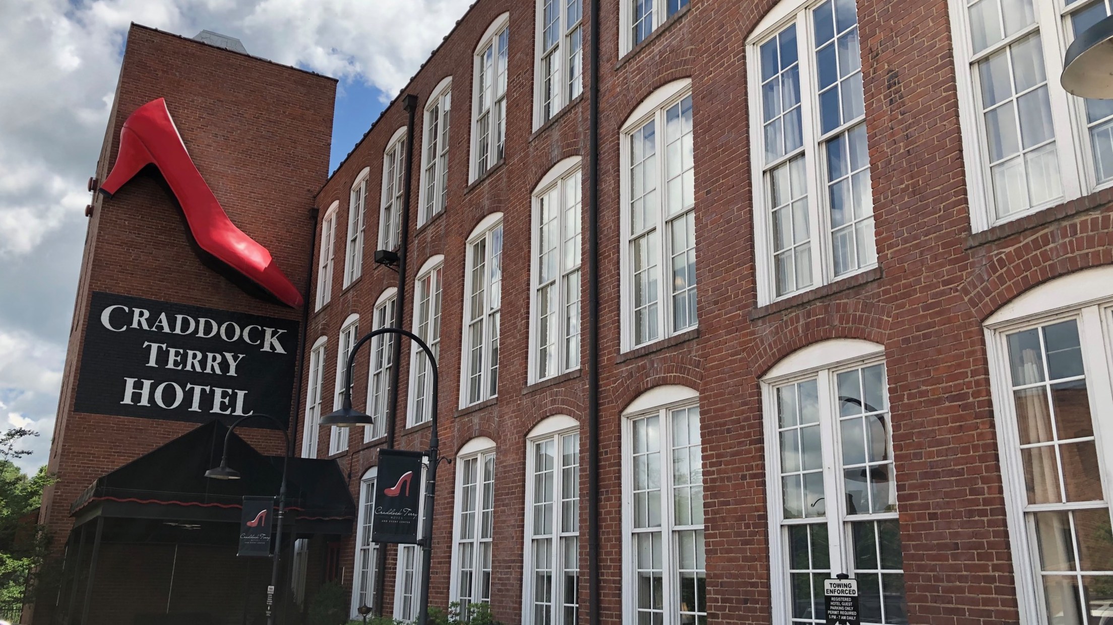 At the Craddock Terry Hotel, shoe-themed art adorns the walls and breakfast is delivered each morning in a vintage wooden shoebox. The hotel is located along Lynchburg's Lower Bluffwalk, with views of the James River below and the Blue Ridge Mountains in the distance.