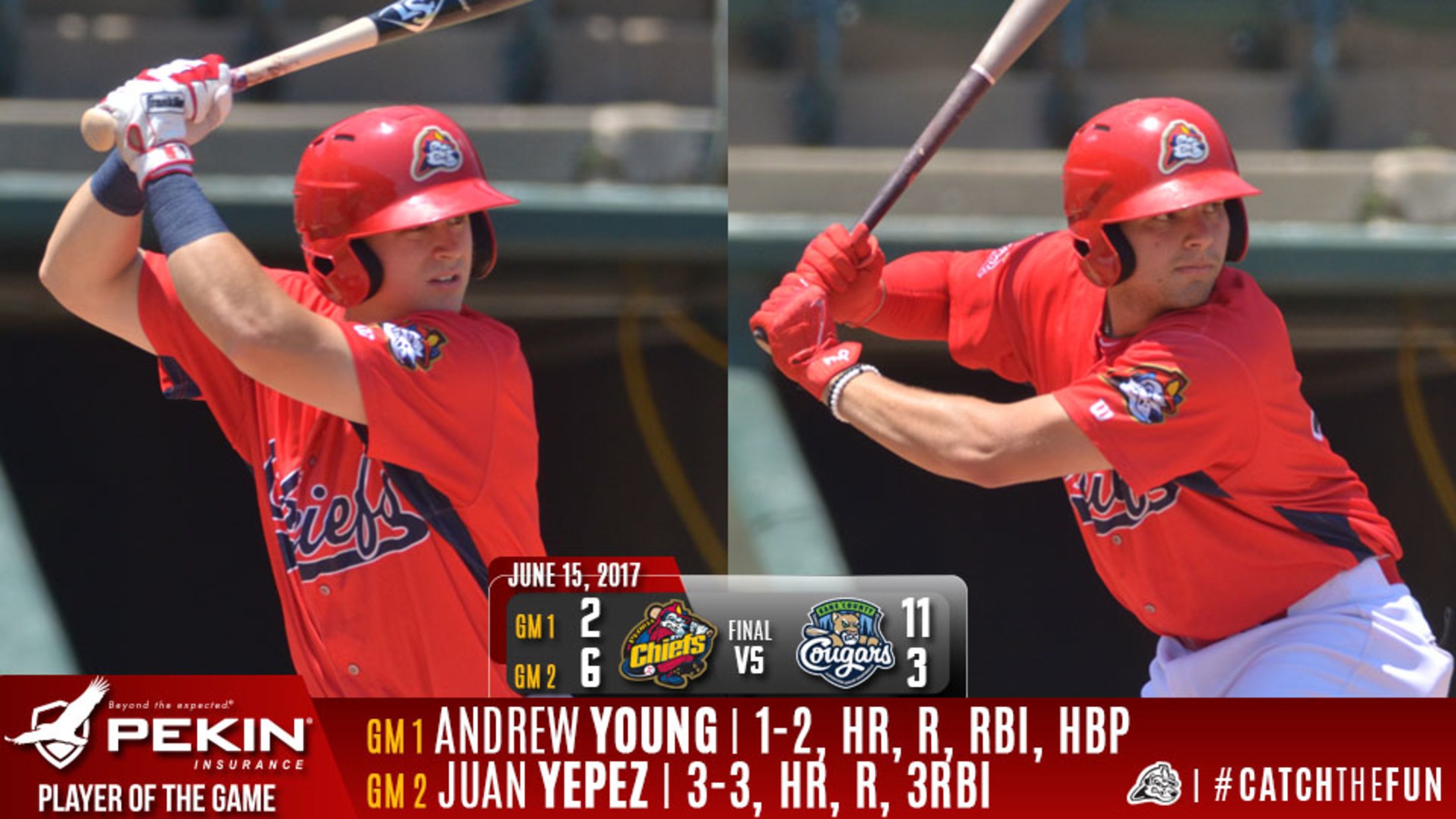 Notes…Billings singled in the third inning of game one and the seventh inning of game two for a 11-game hit streak, the second longest on the Chiefs roster this season…Plummer played for the first time since last Friday while Martinez played for the first time since Saturday…The Chiefs roster is still at just 24 players since Andrew Knizner has not been replaced leaving the team just two bench players for a double header…Young's 11 home runs before the All-Star Break are tied for the most since Josh Vitters hit 13 in 2009…Patrick Wisdom (2013), Mason Katz (2014) and Richard Jones (2011) also had 11 in the first half…Young is tied for third in the MWL with 11 homers and sixth with 37 RBI…He was also hit by a pitch for the 10th time this season which is third in the MWL…Young reached base in both games and is tied for the MWL's longest on-base streak of the season at 29 games…Carlson leads the Chiefs with 27 walks…The Chiefs are now 10-2 in games started by Hicks…The Chiefs split their first three double headers of the season…Hicks allowed a season-high five runs, the second highest earned run tally of his career (8, July 26, 2016)…He hit two batters and leads the MWL with 12 hit batters on the season…The start ended a streak of four straight six-inning outings for Hicks and marks the third time this season he has left the game before the fourth inning ended…Medina allowed his first run in 11 1/23 innings this season…The Chiefs have allowed 10 or more runs seven times this season, all on the road…The Chiefs and Cougars went 3-3 against each other in the first half and will play 11 times in the second half…Peoria has split all four double headers in 2017…The Chiefs return home for the final series of the first half with a Friday first pitch against Burlington set for 7:00 p.m. as the Chiefs start RHP Austin Sexton (2-0, 0.78) against Bees RHP Joe Gatto (3-5, 3.81)…Friday is Star Wars night with Post-Game Fireworks presented by Health Alliance…The first 1000 fans through the gates get a Lightsaber while the Chiefs will be wearing Star Wars themed jerseys which will be auctioned off during the game to benefit the Children's Hospital of Illinois…Star Wars characters from the 501st Midwest Garrison will be on hand and available for photos…Friday is Strike Out Stroke Night with a helicopter landing scheduled for pregame…The broadcast can be heard, starting with the Pre-Game Show at 6:45 p.m. on www.peoriachiefs.com/listenlive which also has downloads for a free app on the iPhone, iPad, Blackberry and Android…The broadcast is also available on the Peoria Chiefs Network in the Tune-In Radio App.