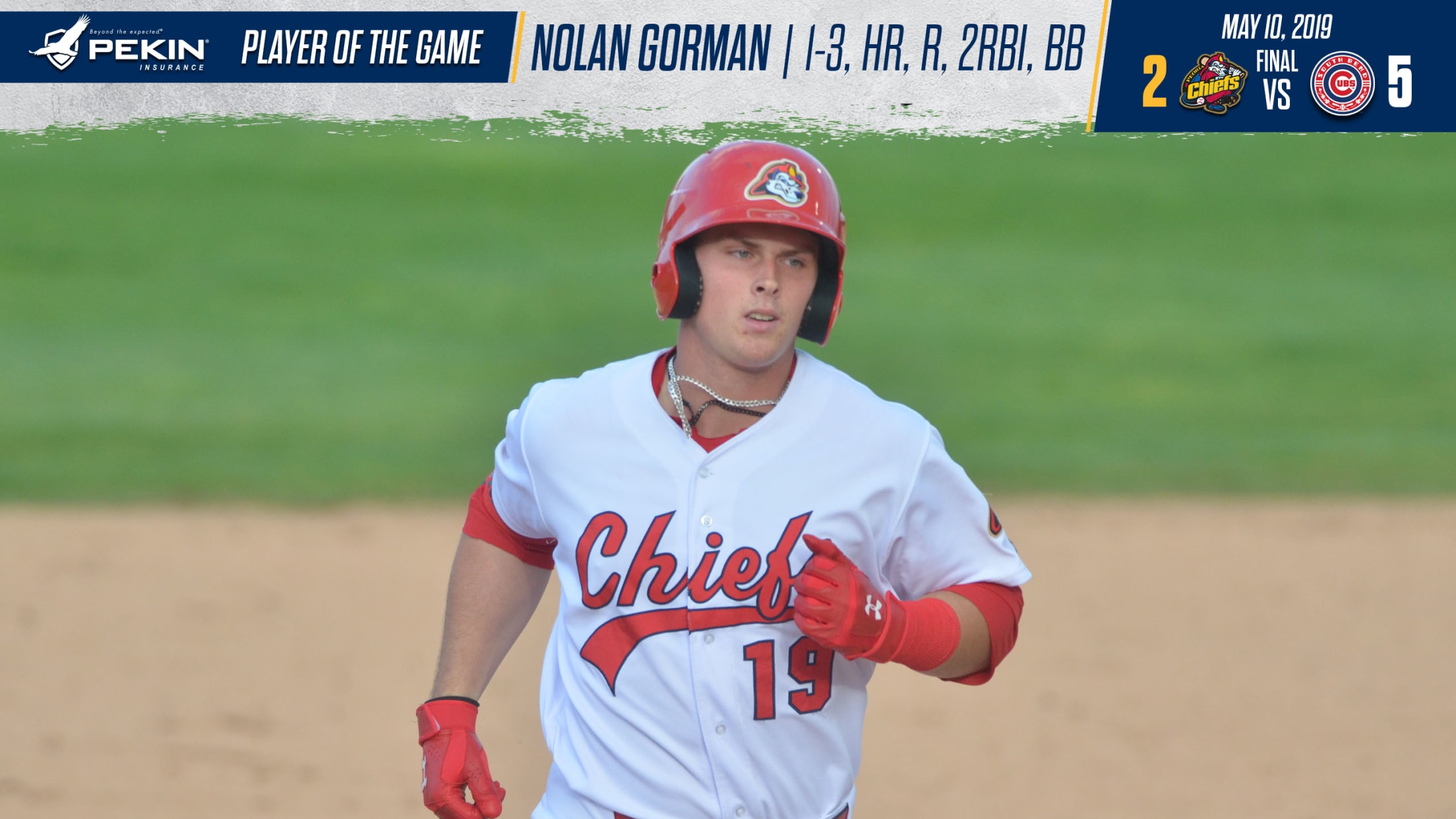 South Bend, IN - Third baseman Nolan Gorman celebrated his 19th birthday with his league-leading eighth homer but the Peoria Chiefs lost 5-2 on Friday night. The loss drops the Chiefs to 15-17 on the season with one game left on the road trip.