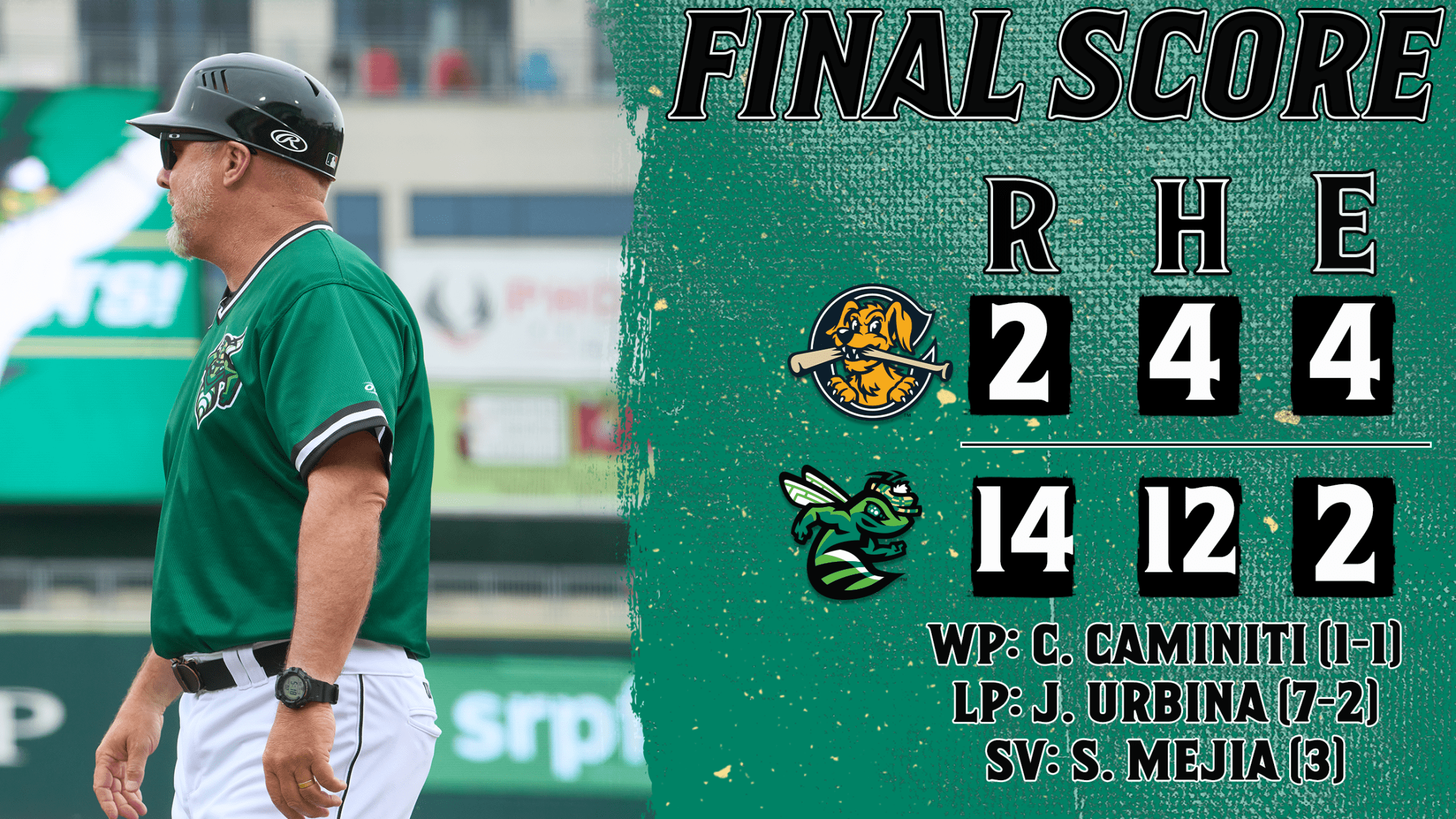 Samuel Mejia worked in relief, and would turn out to be the only reliever necessary, as he held his former team without a run after the 6th and grabbed his third save of the year. Meanwhile, the GreenJackets continued to pull away late, as RBIs from Hartman, John Gil, and Carey against Moises Palma pushed the lead up to 7, and a disastrous 7th inning that featured three hit batters, two walks, and one single added another five runs to the highest total of the year.