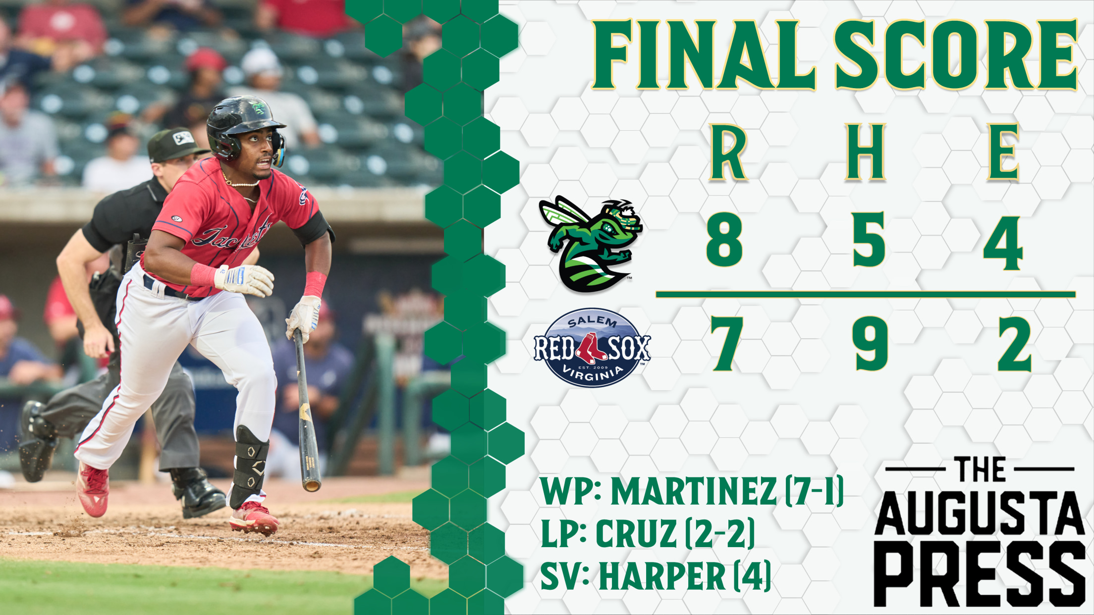 Nolan Martinez surrendered a run to Salem in the seventh inning, before Augusta got a run back in the eighth on Godman’s sacrifice fly. Salem matched the GreenJackets again, getting a run back in the bottom of the inning, before E.J. Exposito gave Augusta some needed insurance with a two-run homer to put the GreenJackets up 8-3.