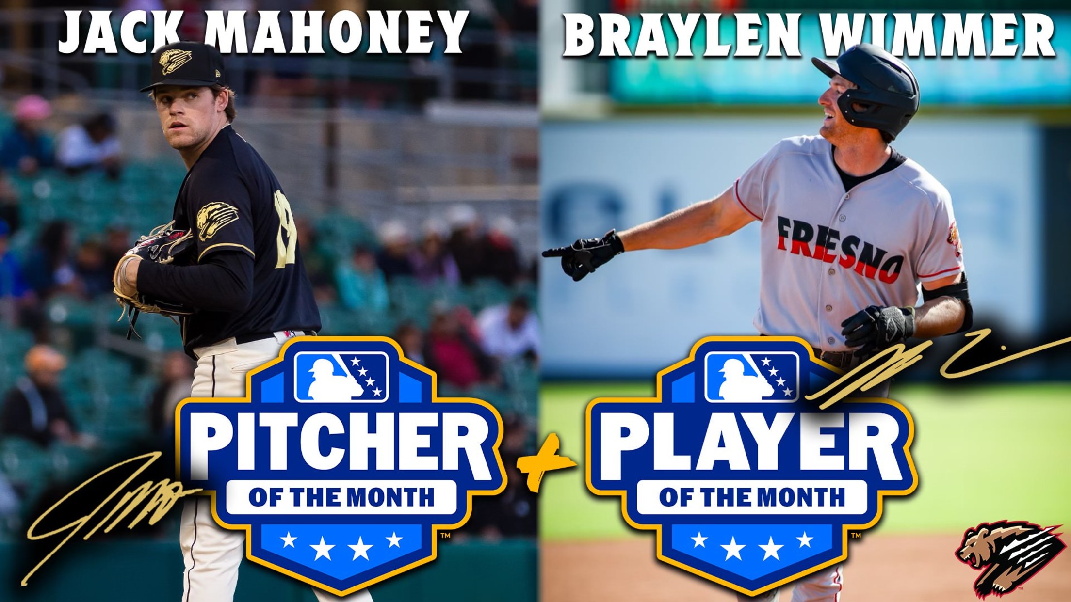 Fresno, CA - Two Fresno Grizzlies were selected by Minor League Baseball for their outstanding performances during the month of June. RHP Jack Mahoney was named California League Pitcher of the Month, while INF Braylen Wimmer received California League Player of the Month. Both Mahoney and Wimmer played together at
