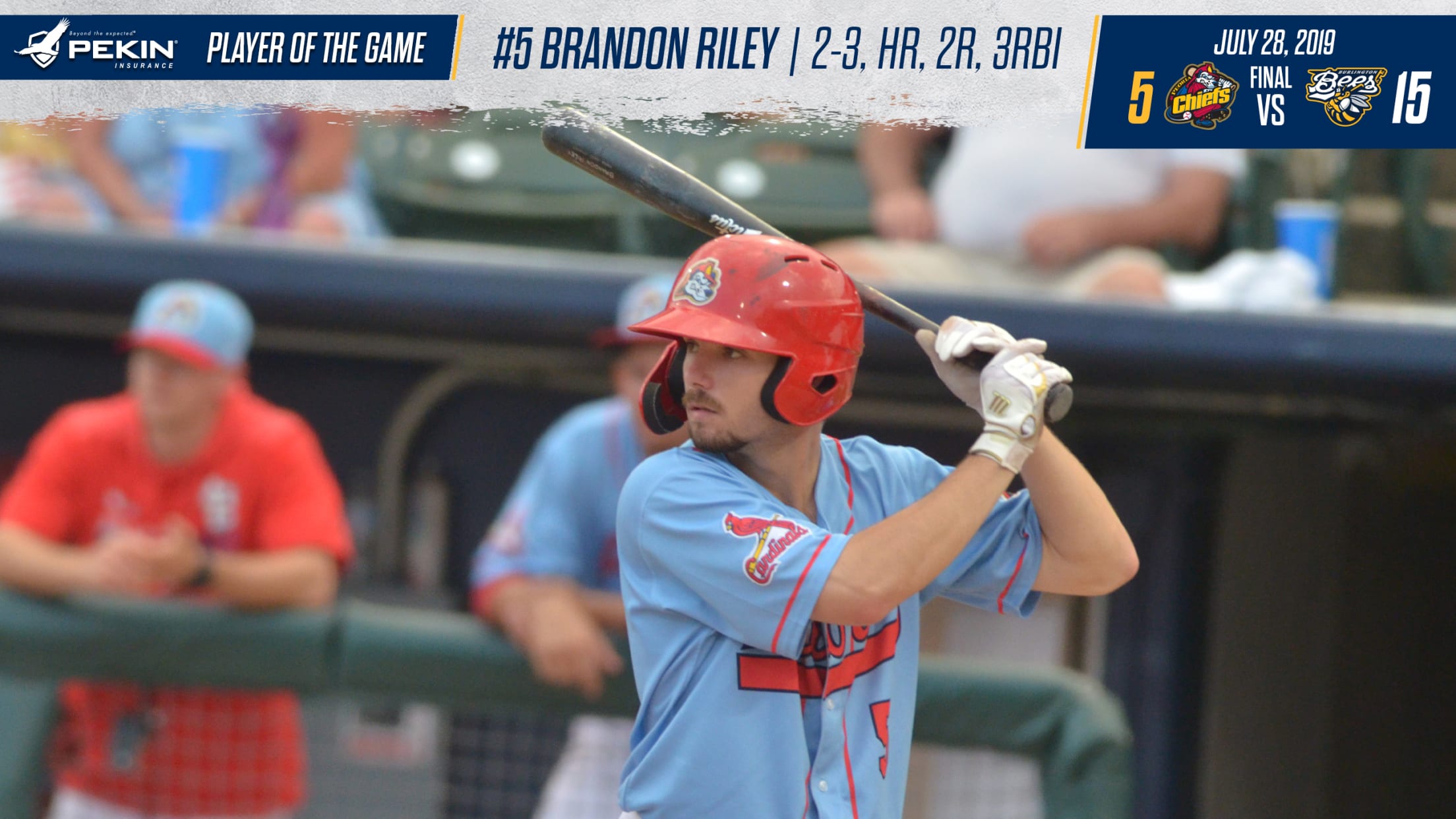 Peoria, IL - The Peoria Chiefs got a strong start from Kyle Leahy, but two bad innings led to a 15-5 loss against the Burlington Bees Sunday night. Brandon Riley went two-for-three with a three-run homerun and was named the Pekin Insurance Beyond the Expected Player of the Game.
