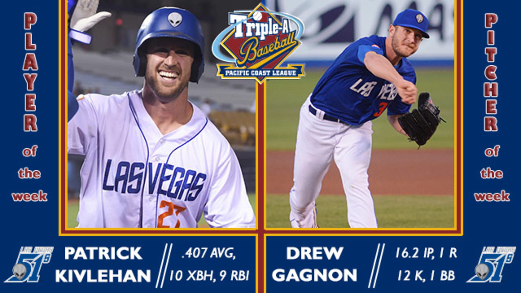 ROUND ROCK, Texas - Las Vegas 51s teammates Patrick Kivlehan (IF/OF) and Drew Gagnon (RHP) have been selected the Pacific Coast League's Player and Pitcher of the Week for the season-ending period of August 27-September 3, 2018, the League office announced. Kivlehan and Gagnon helped the 51s win seven of