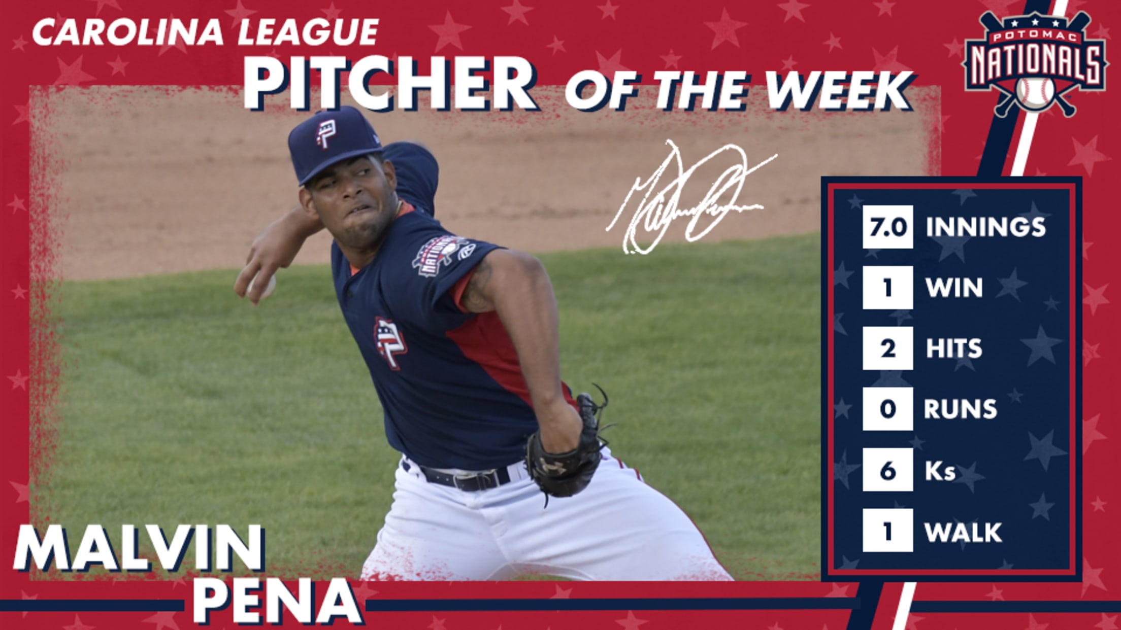 Woodbridge, VA---Earlier today, the Carolina League announced that RHP Malvin Pena was named the Carolina League Pitcher of the Week for the week of June 3rd to June 9th. It is the first weekly award for a Potomac player in 2019.In his lone start this past week, Pena spun arguably Potomac's