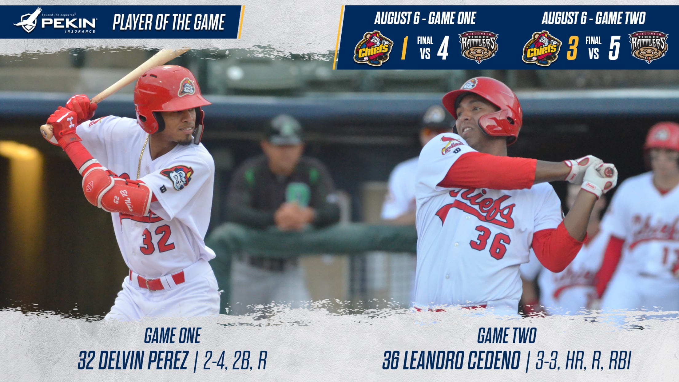 Appleton, WI - The Peoria Chiefs dropped both games of a double header to the Wisconsin Timber Rattlers Tuesday with 4-1 and 5-3 setbacks. Delvin Perez (2-4, 2b, r) and Leandro Cedeno (3-3, HR, r, rbi) were named Pekin Insurance Beyond the Expected Player's of the Game for game one