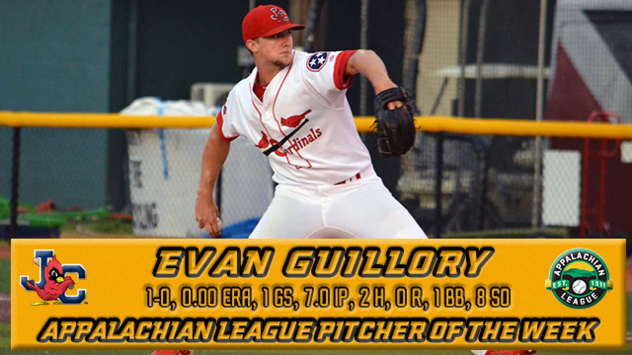 JOHNSON CITY, Tenn. - The Appalachian League announced Monday that Johnson City Cardinals RHP Evan Guillory has been named the circuit's Pitcher of the Week for the time period between August 7-13. This is the 21-year-old's first award of his professional career. In his lone start during the week - on