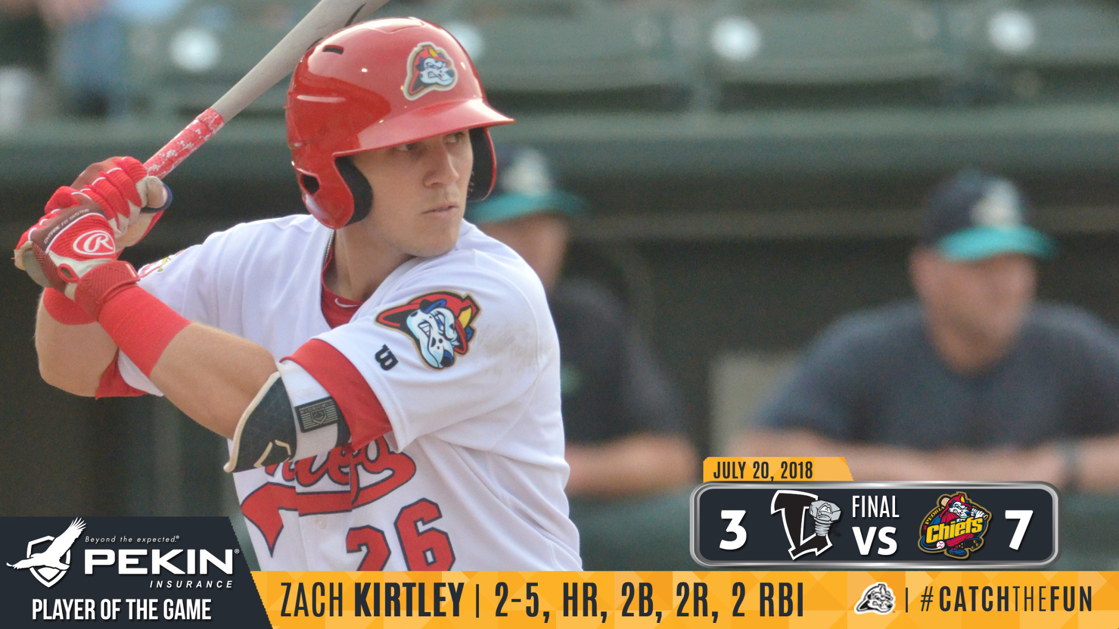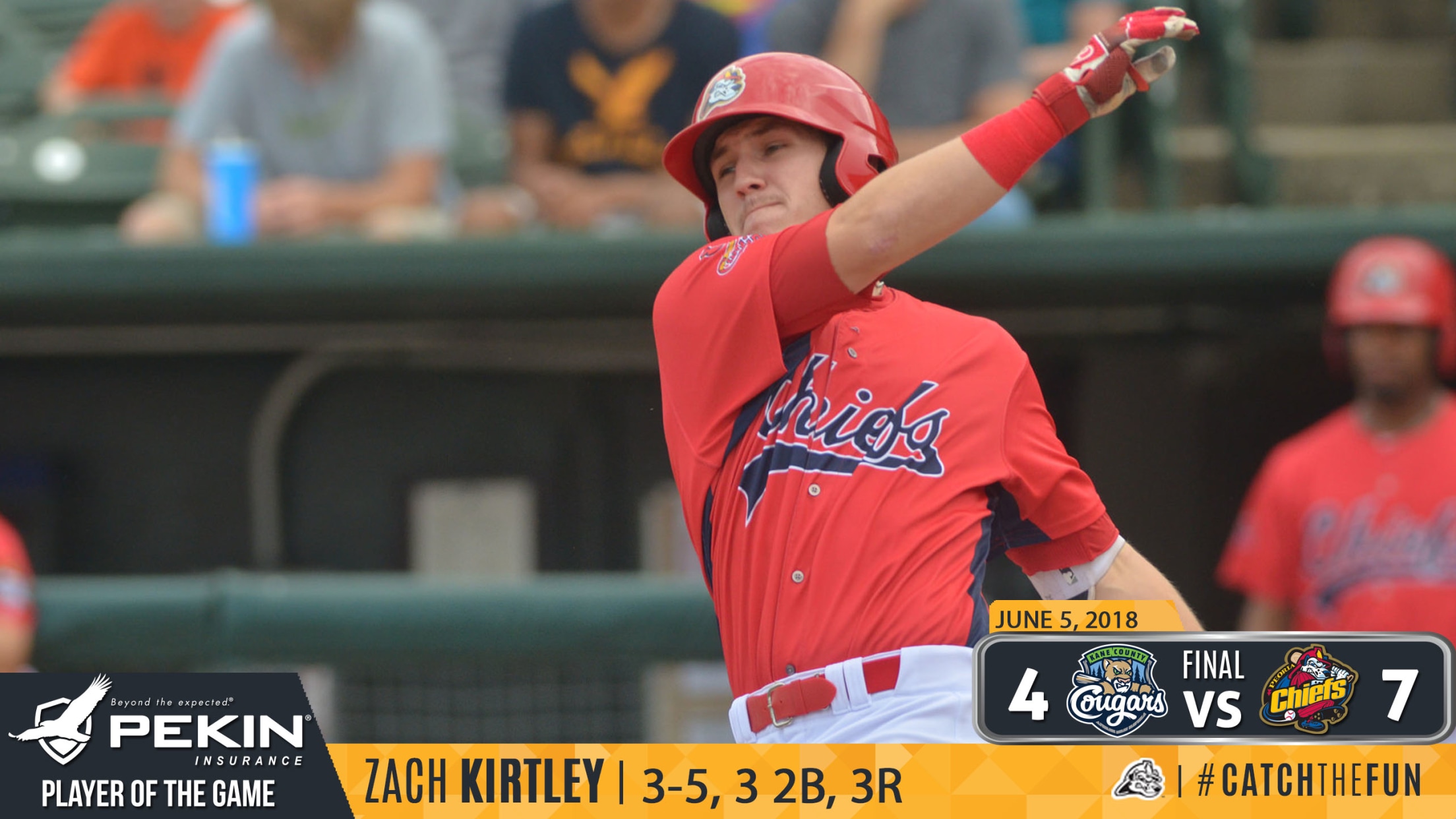 Geneva, IL- The Peoria Chiefs held off a late surge by the Kane County Cougars to take game one of the series by a score of 7-4. The Chiefs improved to 33-25 overall and are now in sole possession of first place in the Western Division with game two of