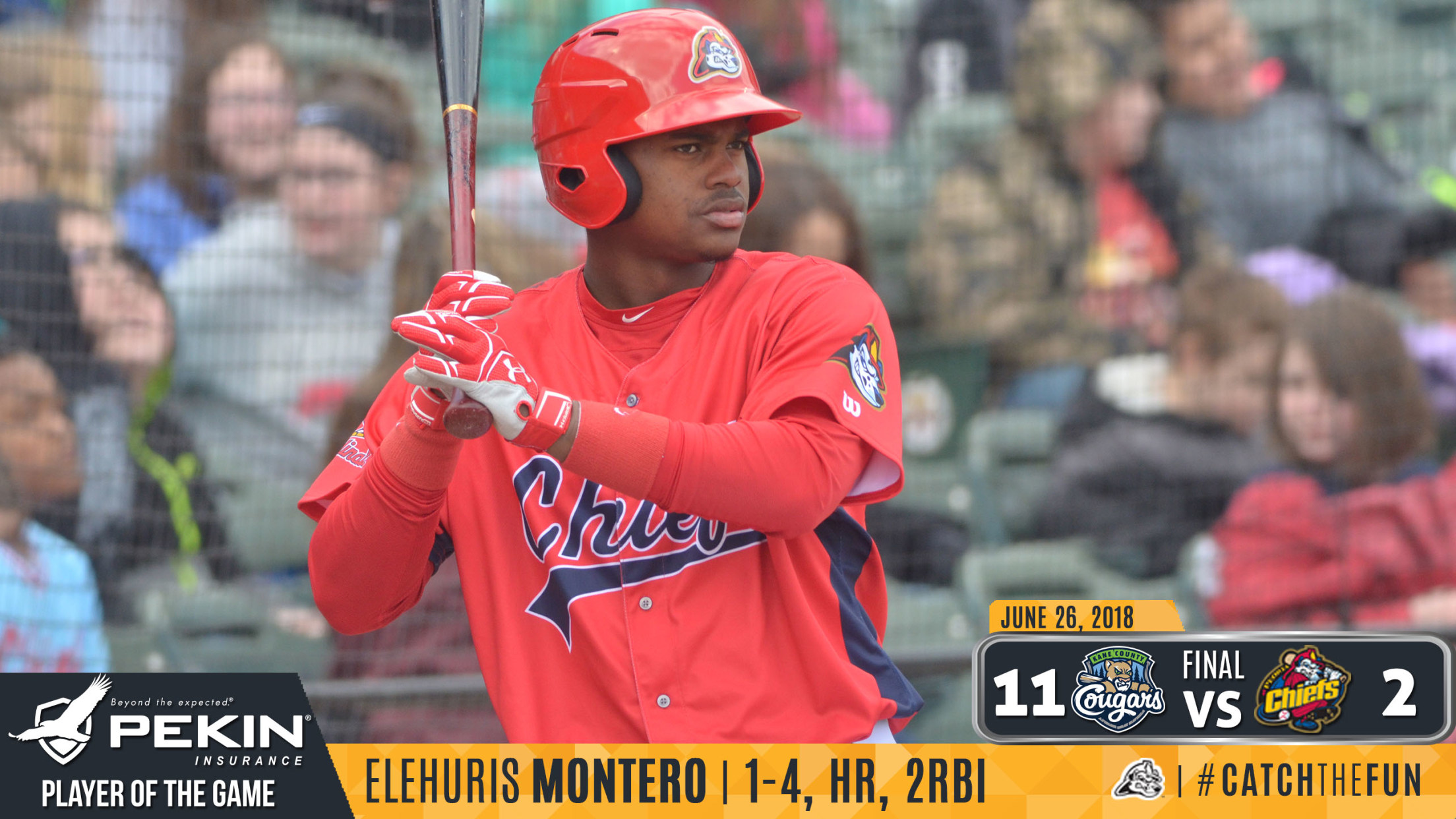 Clinton, IA - Elehuris Montero tied a franchise and Midwest League record with four doubles on Sunday as the Peoria Chiefs beat the Clinton LumberKings 12-3. The win moves the Chiefs to 22-12 in the second half and 61-43 overall, the best record in the Western Division.