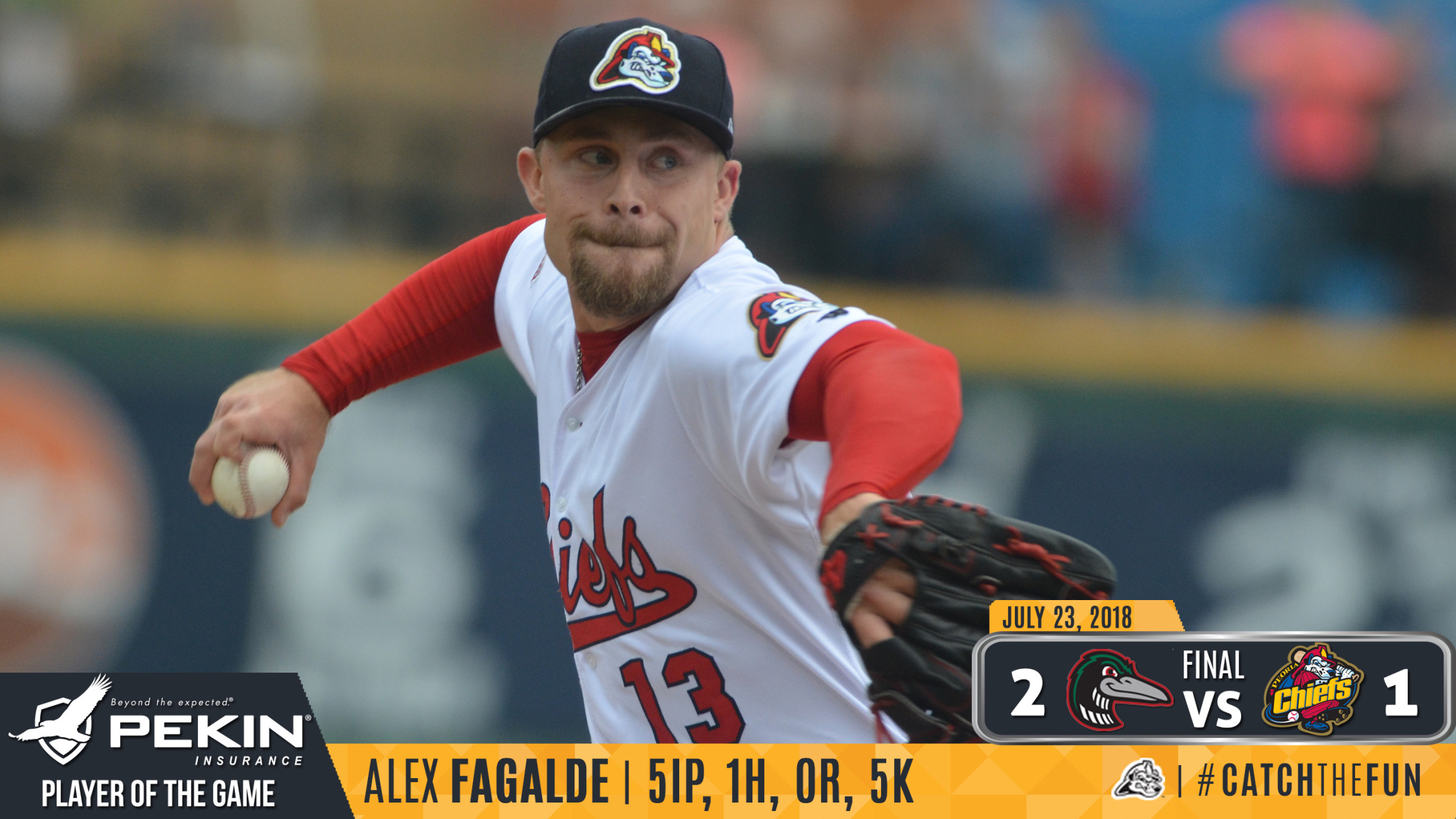 Clinton, IA - Alex Fagalde allowed just one hit and struck out 10 over seven shutout innings as the Peoria Chiefs opened a road series with a 5-1 win over the Clinton LumberKings Saturday night. The win moves the Chiefs to a season-high 17 games over .500 at 60-43 and