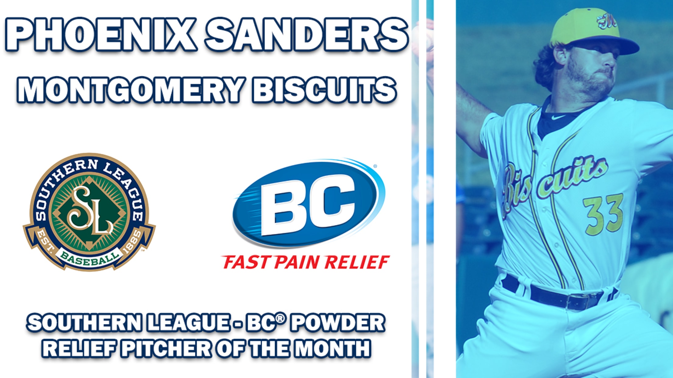 MARIETTA, GA - The Southern League of Professional Baseball Clubs are proud to announce that Montgomery Biscuits RHP Phoenix Sanders has been named the BC® Relief Pitcher of the Month for July. Sanders is the second straight Biscuits bullpen arm to win the award.