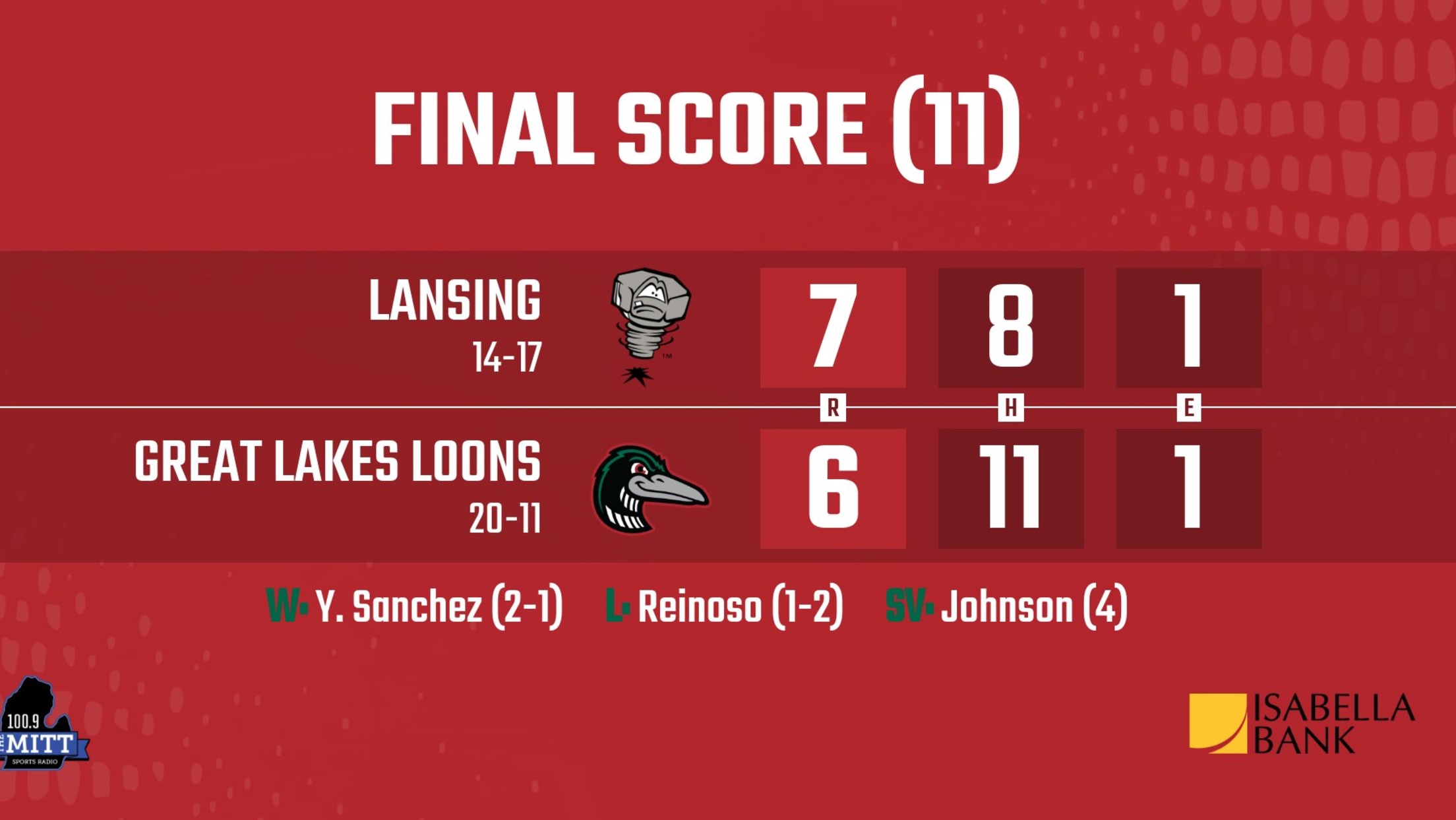 MIDLAND, Mich. – The Great Lakes Loons (20-11) tying runner was tagged out at third base for the third out in the bottom of the eleventh as the Lansing Lugnuts (13-17) fought for a 7-6 win on a 66-degree partly cloudy Friday night at Dow Diamond. The contest featured six