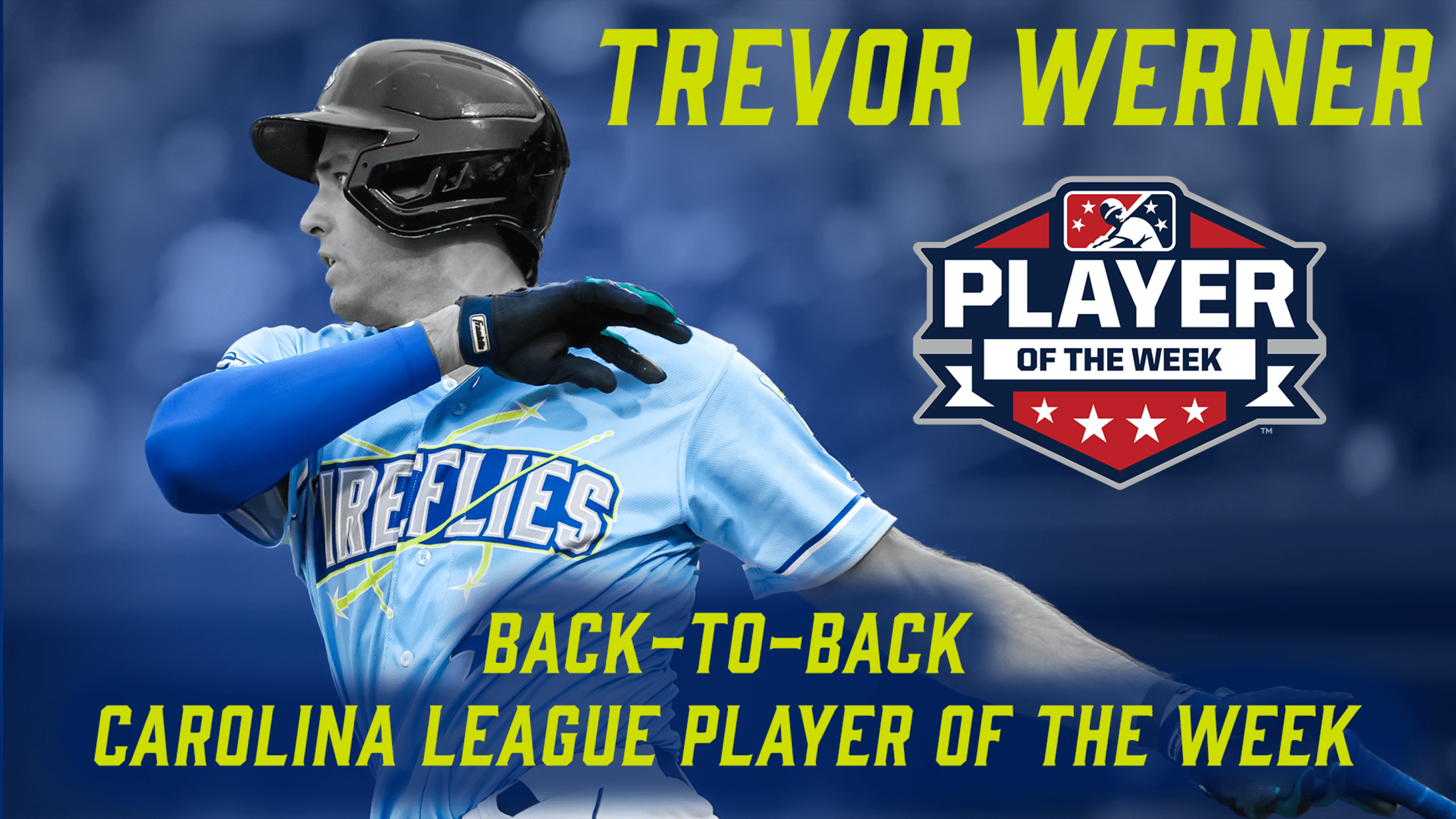 COLUMBIA, SC – The Columbia Fireflies, in conjunction with the Carolina League and Major League Baseball, have announced that Trevor Werner has been named the Carolina League Player of the Week for the week of August 28-September 3. Werner is the first Fireflies player to win the award in back-to-back