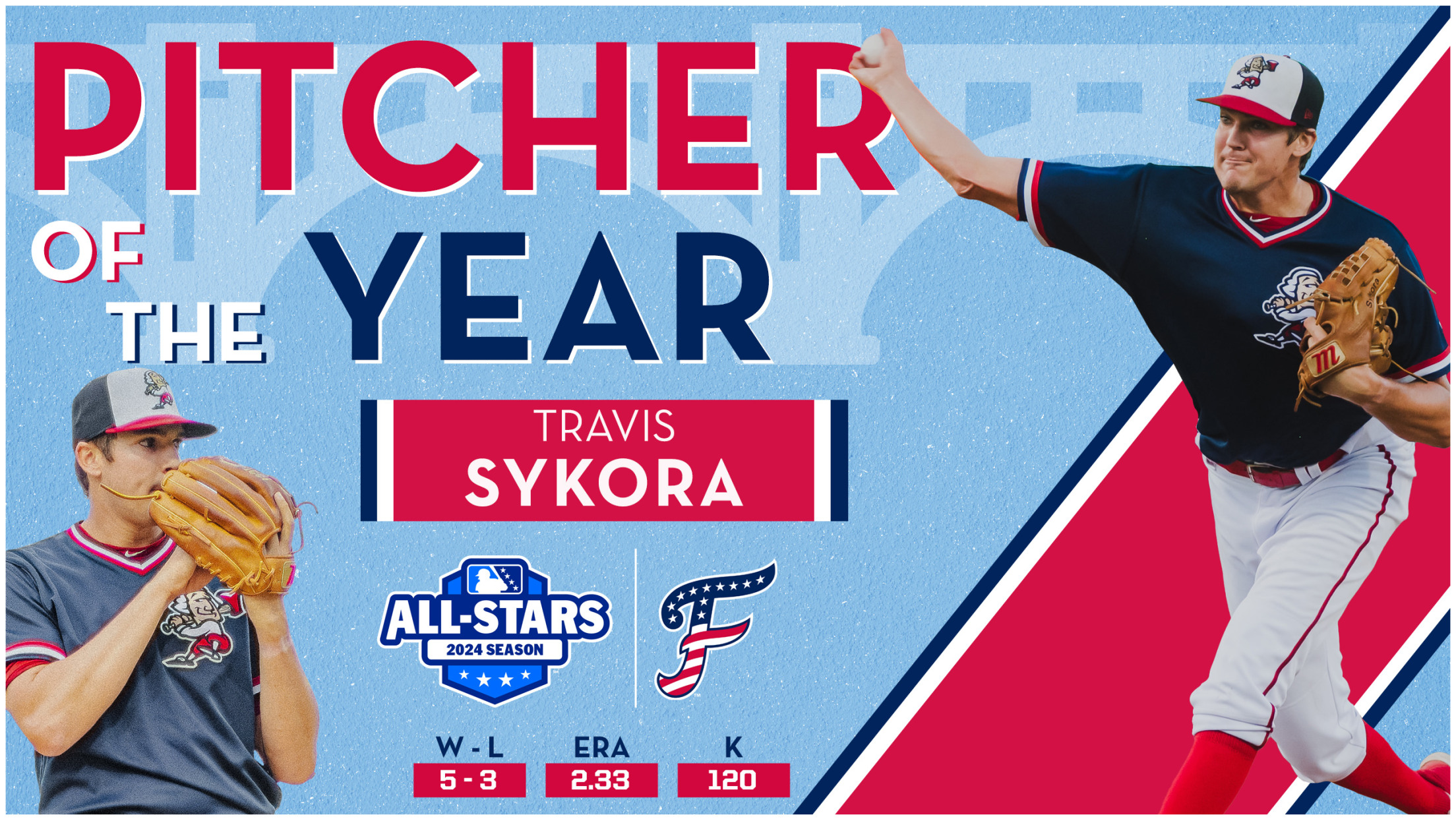 FREDERICKSBURG, VA - FredNat starting pitcher Travis Sykora has been named the Carolina League's Pitcher of the Year in 2024, Minor League Baseball announced today. Sykora and the FredNats aim to finish off the campaign with the first league championship in Fredericksburg franchise history tonight.