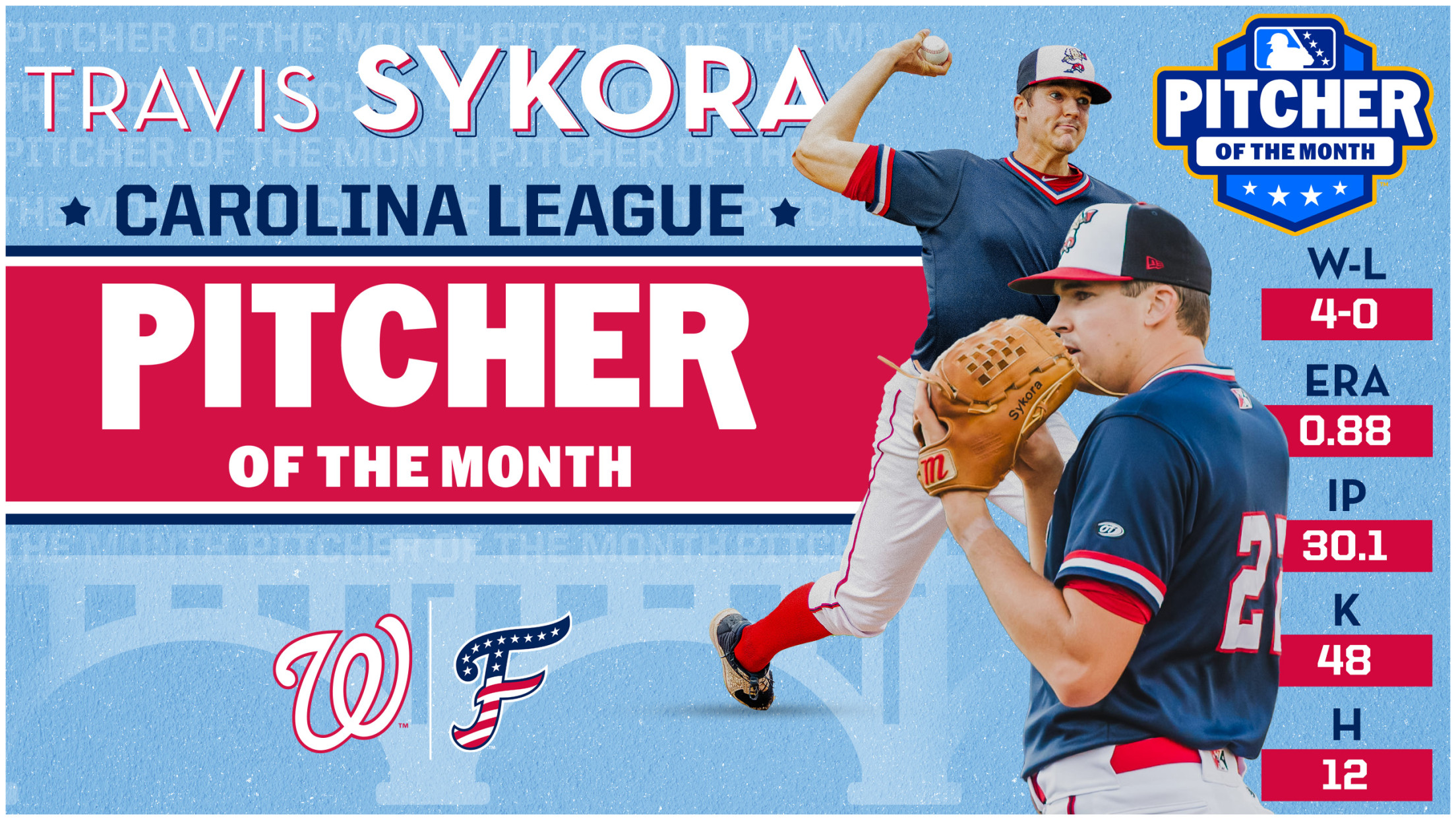 FREDERICKSBURG, VA - FredNat starting pitcher Travis Sykora has been named the Carolina League's Pitcher of the Month for August, Minor League Baseball announced today. Sykora is the second straight FredNat hurler to win Pitcher of the Month after Marc Davis won the honor for July.