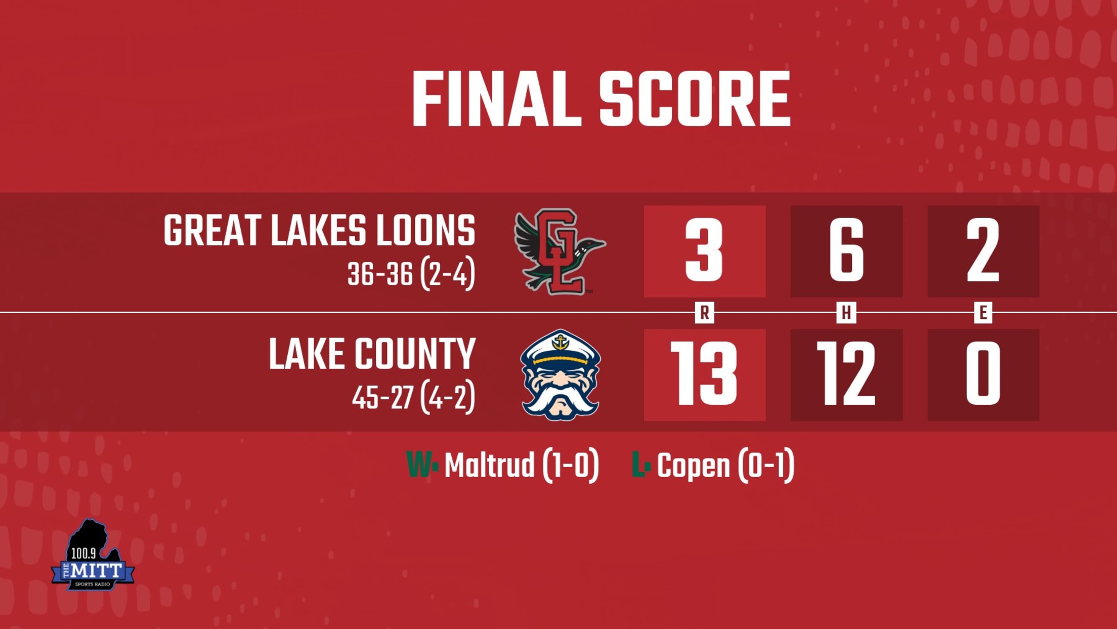 MIDLAND, Mich. – The Lake County Captains (45-27) (4-2) scored 13 runs on 12 hits trouncing the Great Lakes Loons (36-36) (2-4) 13-3 on a 69-degree partly cloudy Thursday night at Classic Auto Group Park. - Great Lakes starter Patrick Copen permitted two runs in 2.2 innings in his Midwest