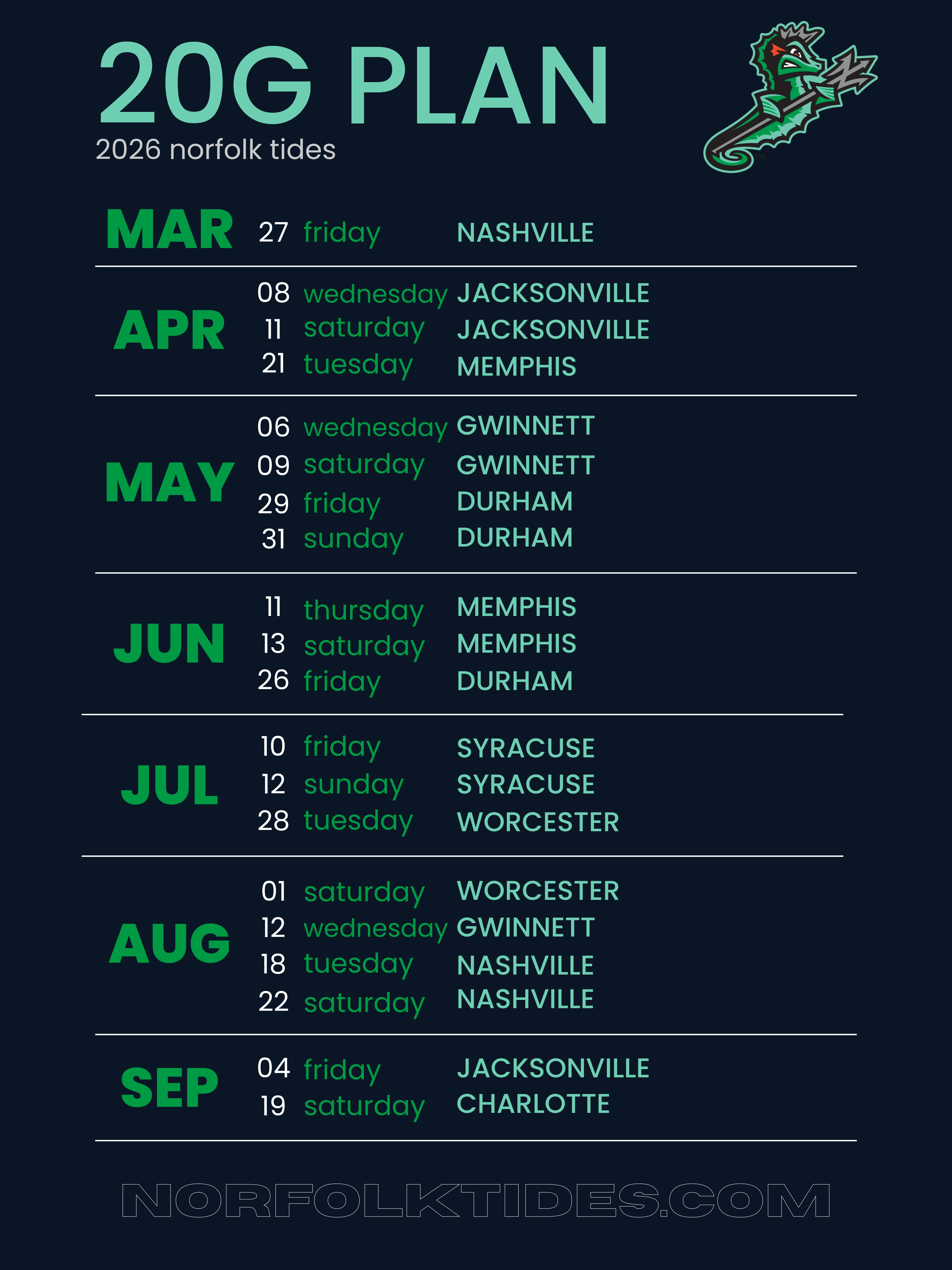 - April - Wednesday, April 8 vs. JAX | Saturday, April 11 vs. JAX | Tuesday, April 21 vs. MEM