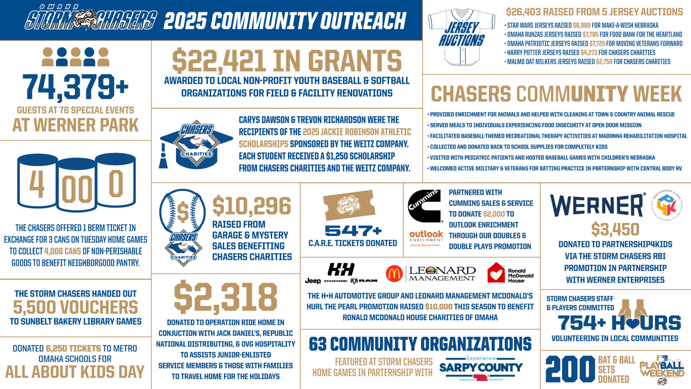 PAPILLION, Neb. – The Omaha Storm Chasers and Chasers Charities have announced highlights of the team’s community service efforts for the 2025 season, with $666,097 in monetary and in-kind donations raised by the club throughout the year. Storm Chasers front office staff and players volunteered 754 hours in 2025, supporting