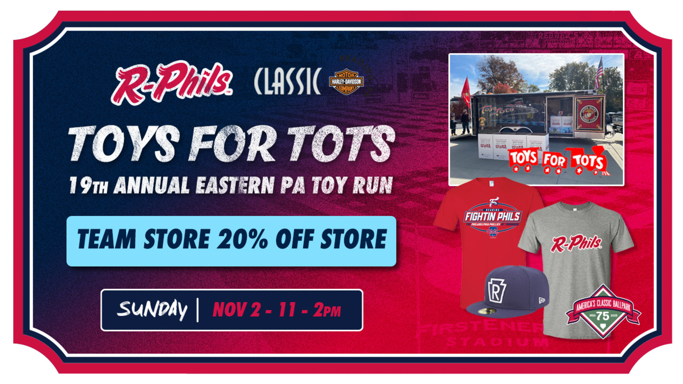 (Reading, PA) - The Reading Fightin Phils and Classic Harley-Davidson are excited to partner for a Toys for Tots event at FirstEnergy Stadium on Sunday, November 2, from 11 a.m. to 2 p.m. It will be the 19th annual Eastern PA Toy Run. Proceeds from the event will benefit the