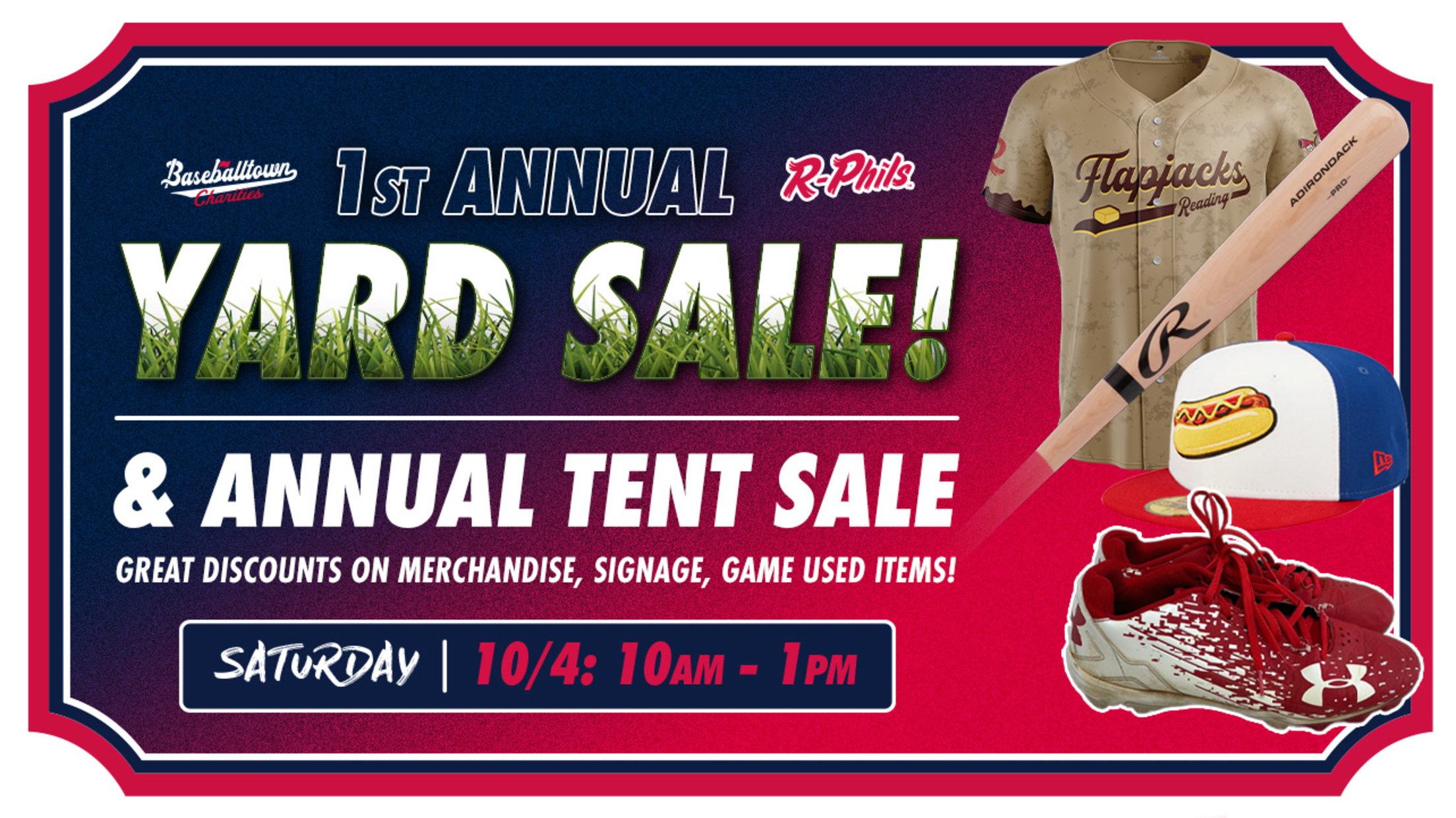 (Reading, PA) – The Reading Fightin Phils, Double-A affiliate of the Philadelphia Phillies, are excited to host the first-ever Baseballtown Charities Yard Sale, alongside the Annual Tent Sale, on Saturday, October 4, from 10 a.m. to 1 p.m. at FirstEnergy Stadium. Also happening that day: our Season Ticket Holder Party,