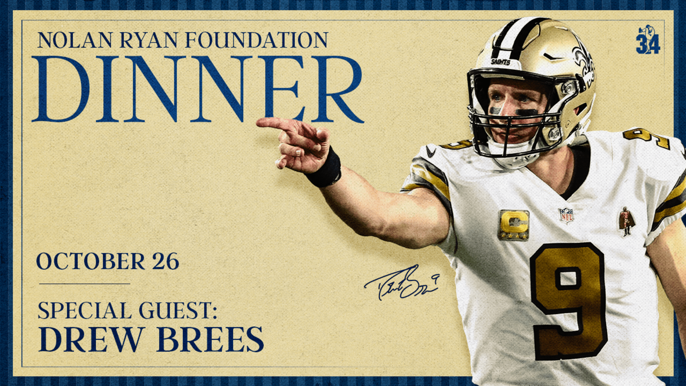 ROUND ROCK, Texas – The Nolan Ryan Foundation announced that the 2025 Nolan Ryan Foundation Dinner will take place on Sunday, October 26 at Kalahari Resorts & Convention Center. Austin native and Super Bowl XLIV Champion & MVP, Drew Brees, is set to attend this intimate, once-in-a-lifetime dinner. Brees is