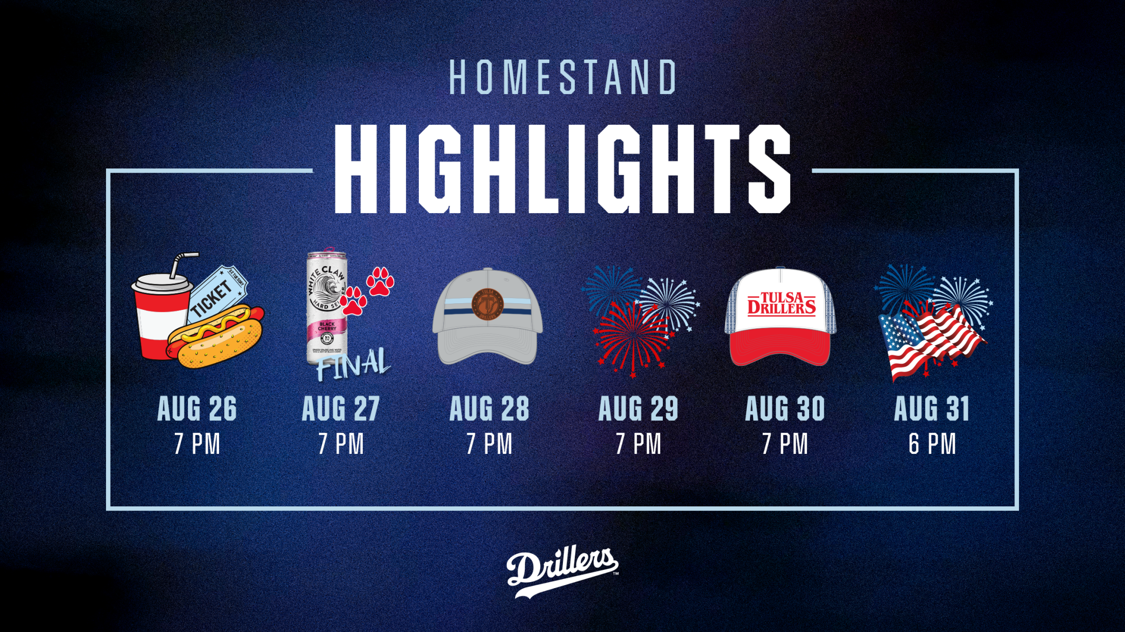 The Tulsa Drillers will continue their pursuit of a spot in the 2025 Texas League playoffs during a six-game home stand that will run from August 26-31 at ONEOK Field. The Drillers will host the Corpus Christi Hooks (Houston Astros) for all six games. Every game in the series will